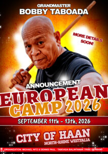 Das European Camp 2026 mit GM Bobby Taboada in Deutschland findet erstmals in Haan (NRW) am 12./13. September 2026 statt.Das Seminar wird weiterhin von Guro Michael Nitz (Head of Tribe Germany) in Zusammenarbeit mit dem Pazuru Gym unter der Leitung von Dennis Paul ausgrichtet. Wir haben auch dieses Mal keine Mühen gescheut, um wieder ein unvergessliches Erlebnis zuschaffen. Last Euch überraschen und seid am 12./13. September 2026 in Haan mit dabei. Alle Informationen und die Anmeldung zum Seminar findet ihr ab Mitte März auf unserer Website: www.signupyourseminar.de