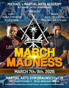 Das MARCH MADNESS Seminar 2026 findet am 07.&08. März 2026 in Braunschweig im Martial Arts Gym statt. Als Lehrer konnten wir Guro Frans Stroeven und Guro Jhun Occidental verpflichten. Beide werden an dem Wochenende eine Fülle von Techniken und Sequenzen zeigen. Insgesamt warten gut 10 Stunden Training auf Euch. Also schnell anmelden und dabei sein. Wir haben nur begrenzte Plätze zu Verfügung. Alle Informationen und die Anmeldung findet ihr auf unserer Website: www.signupyourseminar.de
